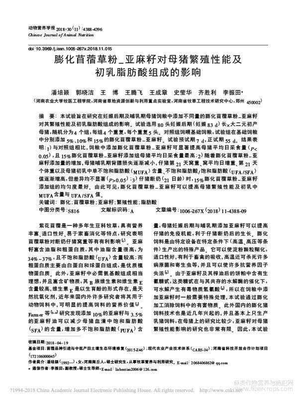 膨化苜蓿草粉-亚麻籽对母猪繁殖性能及初乳脂肪酸组成的影响