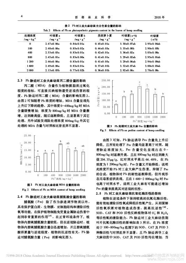 铅(Pb)胁迫对工业大麻苗期生理生化及富集特征的影响