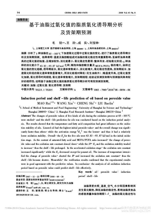 基于油脂过氧化值的脂质氧化诱导期分析及货架期预测(亚麻籽油)_毛锐