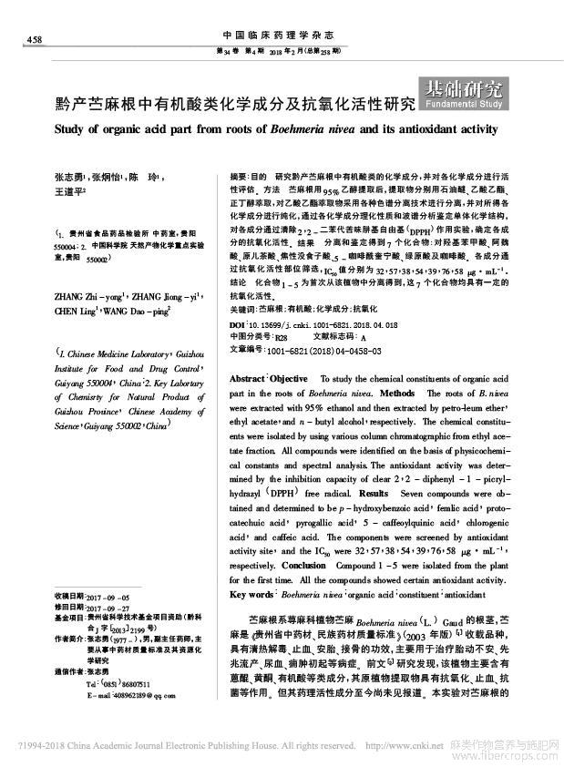 黔产苎麻根中有机酸类化学成分及抗氧化活性研究