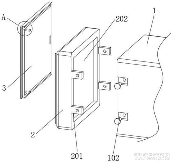 1.工业大麻溯源监管装置,包括监管摄像端部(1)、防护玻璃外壳(2)和外侧盖板(3),其特征在于:所述监管摄像端部(1)的头部固定安装有摄像头主体(101),所述防护玻璃外壳(2)上开设有矩形通槽(200),所述防护玻璃外壳(2)固定安装在监管摄像端部(1)的头部,所述摄像头主体(101)位于矩形通槽(200)内,所述矩形通槽(200)的内部固定安装有防护玻璃主体(202);