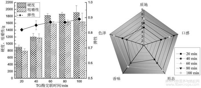 由图10和图11可知,在交联时间为20min基础上,随着TG酶作用时间的增大,硬度、咀嚼性和弹性呈增大,当交联时间为60min时,硬度、咀嚼性和弹性增大的趋势趋于稳定;超过60min,交联时间再增加,产品的性能不仅不能有效提升,部分性能还呈下降趋势;因此,本发明优选TG酶交联时间为60min。