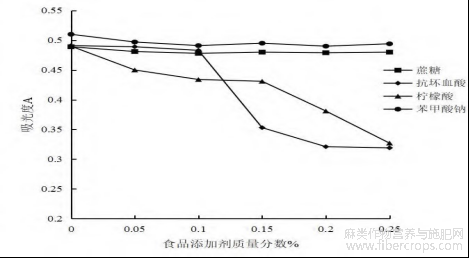 取蔗糖、抗坏血酸、柠檬酸食品添加剂及苯甲酸钠防腐剂,向总黄酮粗提液中分别加入上述不同质量分数的4种食品添加剂,其浓度梯度设置为0、0.05%、0.1%、0.15%、0.2%、0.25%,各浓度下的溶液静置0.5h,按总黄酮检测方法开始检测,记录数值,整理并绘图[13]。