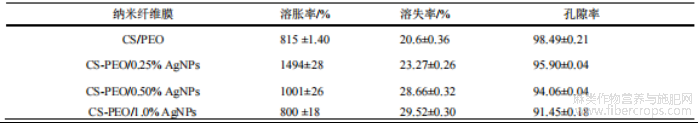 表1 不同质量分数AgNPs对复合纳米纤维膜溶胀/溶失率以及孔隙率的影响