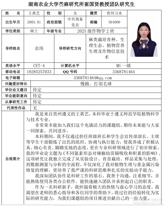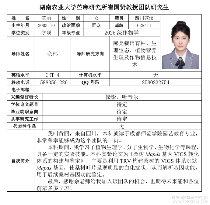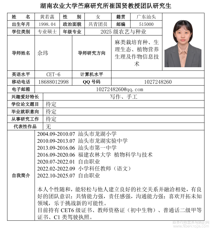 湖南农业大学苎麻研究所崔国贤教授团队研究生(截止2025-10-10)