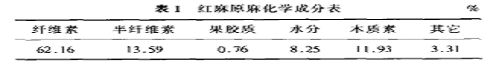1.1.1 原 麻 红麻生麻取自辽宁朝阳地区种植的前一年的陈麻,采用GB 5889—86的方法测其化学成分见表1。