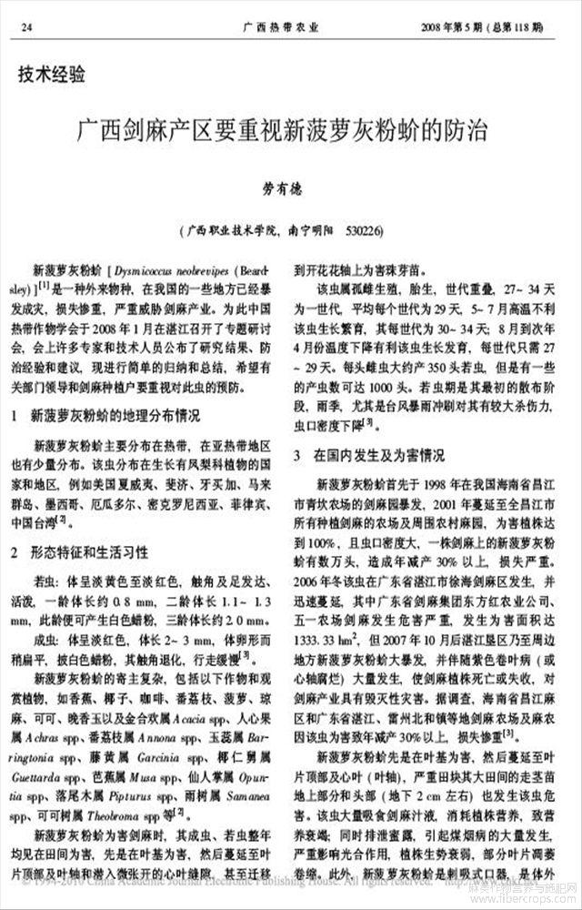 广西剑麻产区要重视新菠萝灰粉蚧的防治
