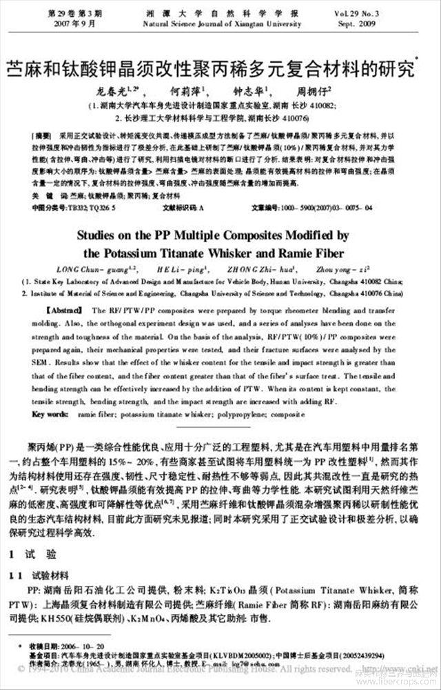 苎麻和钛酸钾晶须改性聚丙稀多元复合材料的研究