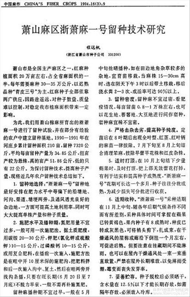 萧山麻区浙萧麻一号留种技术研究