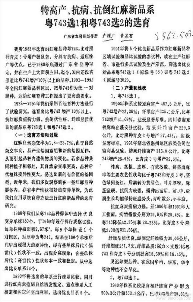 特高产、抗病、抗倒红麻新品系奥743选1和奥743选2的选育