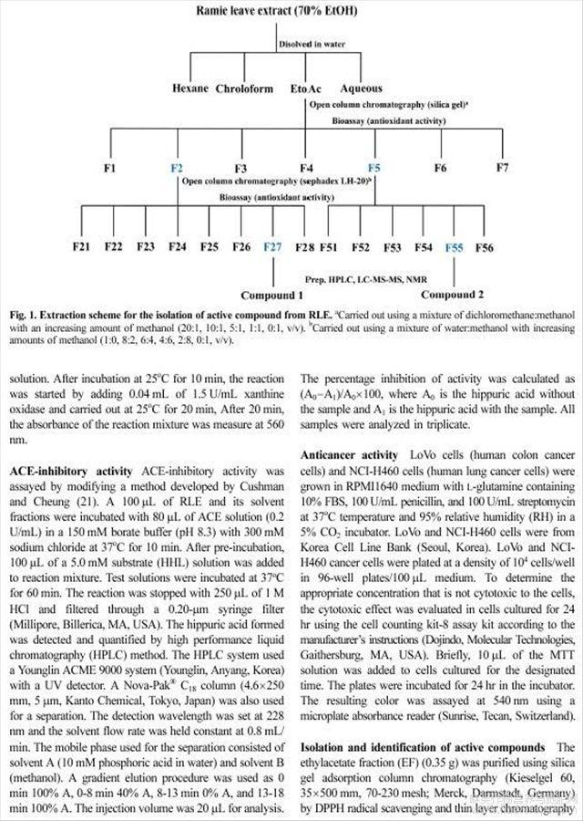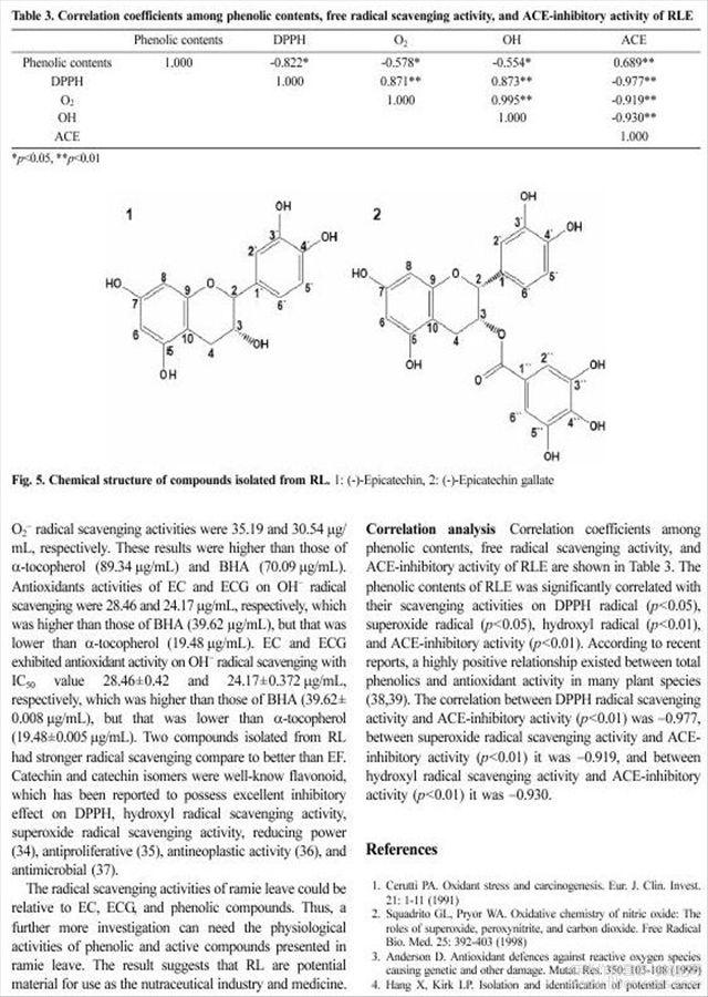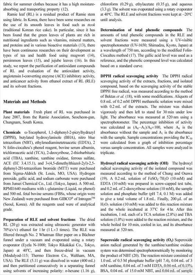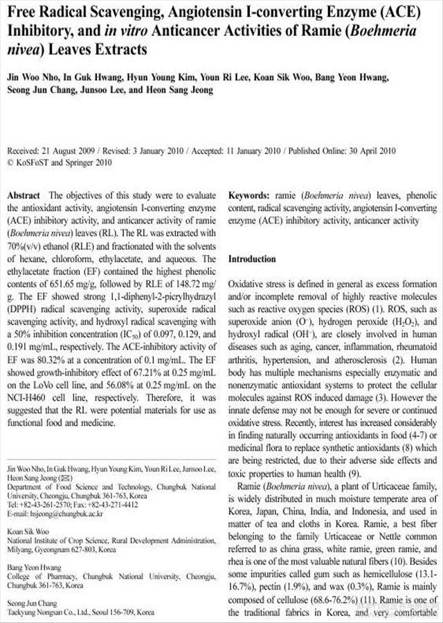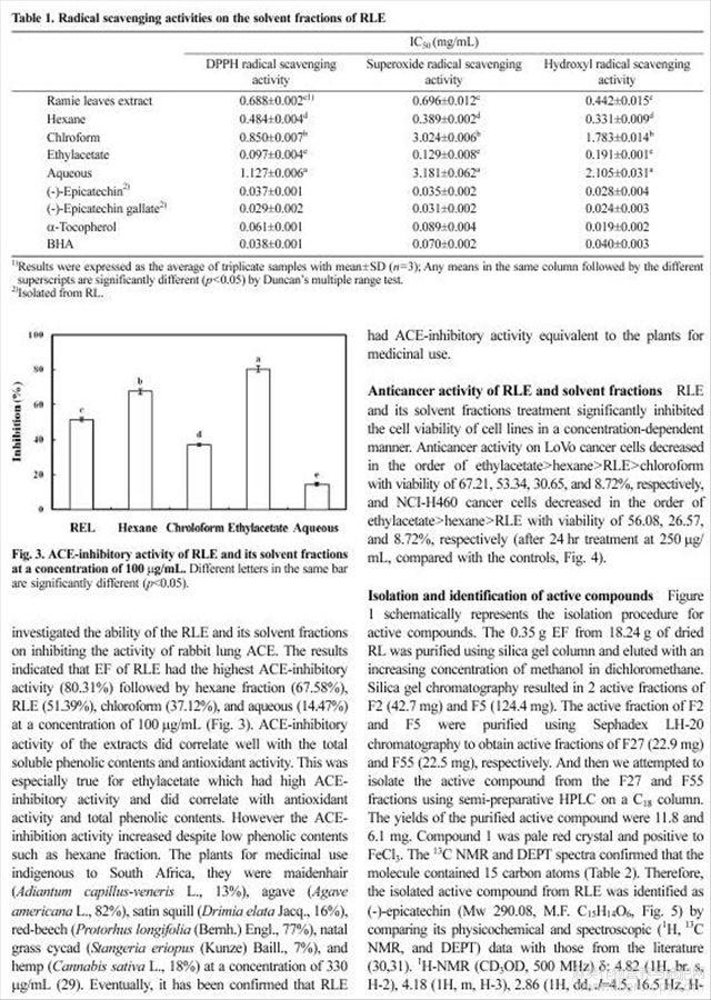 苎麻叶片提取物中的自由基清除能力,ACE抑制水平以及体外抗癌活性的研究(英文)