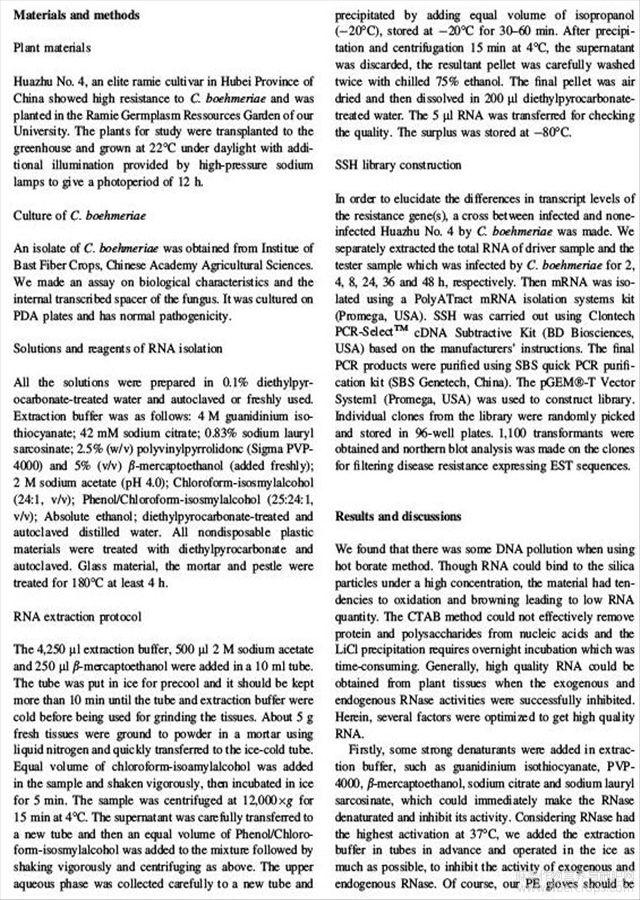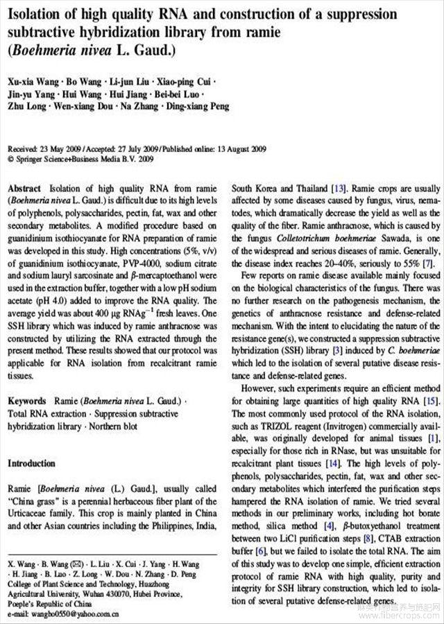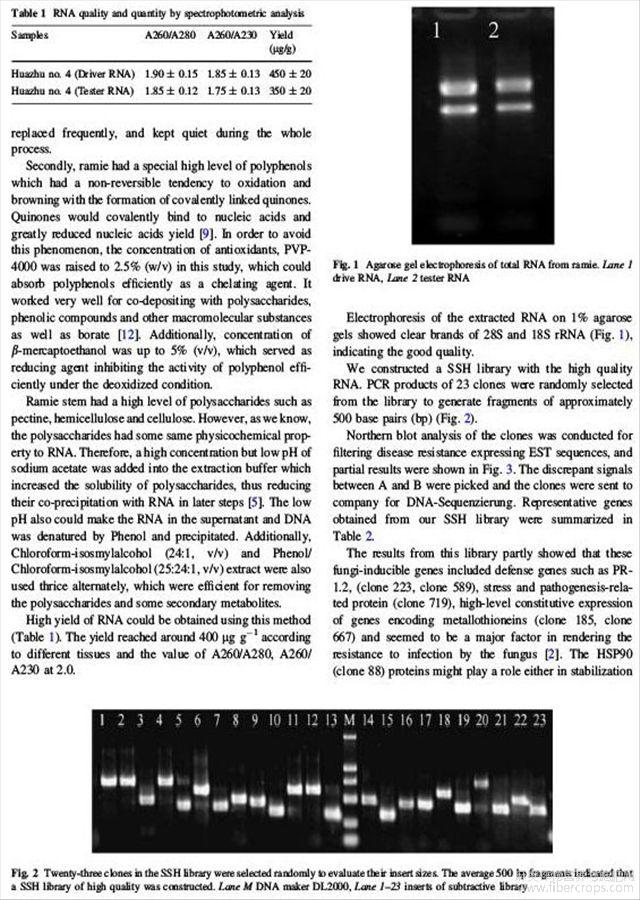 苎麻优质RNA的分离和抑制性扣除杂交库的研究(英文)