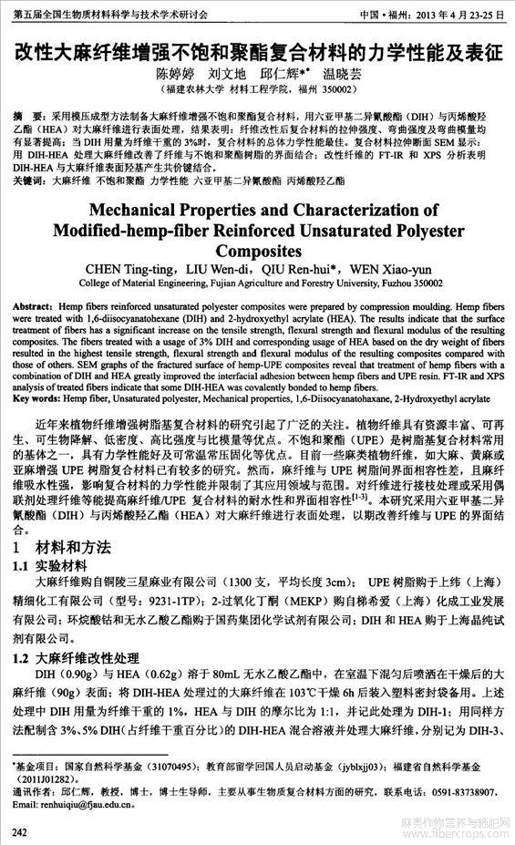 改性大麻纤维增强不饱和聚酯复合材料的力学性能及表征(会议论文)