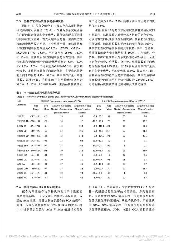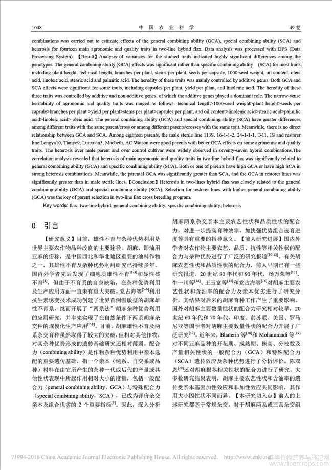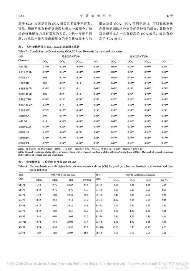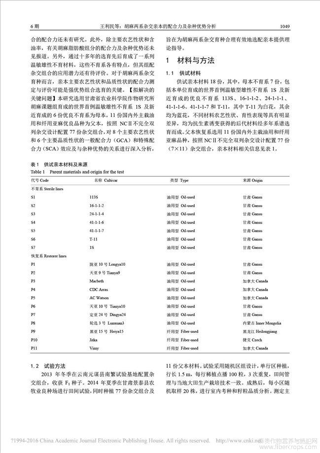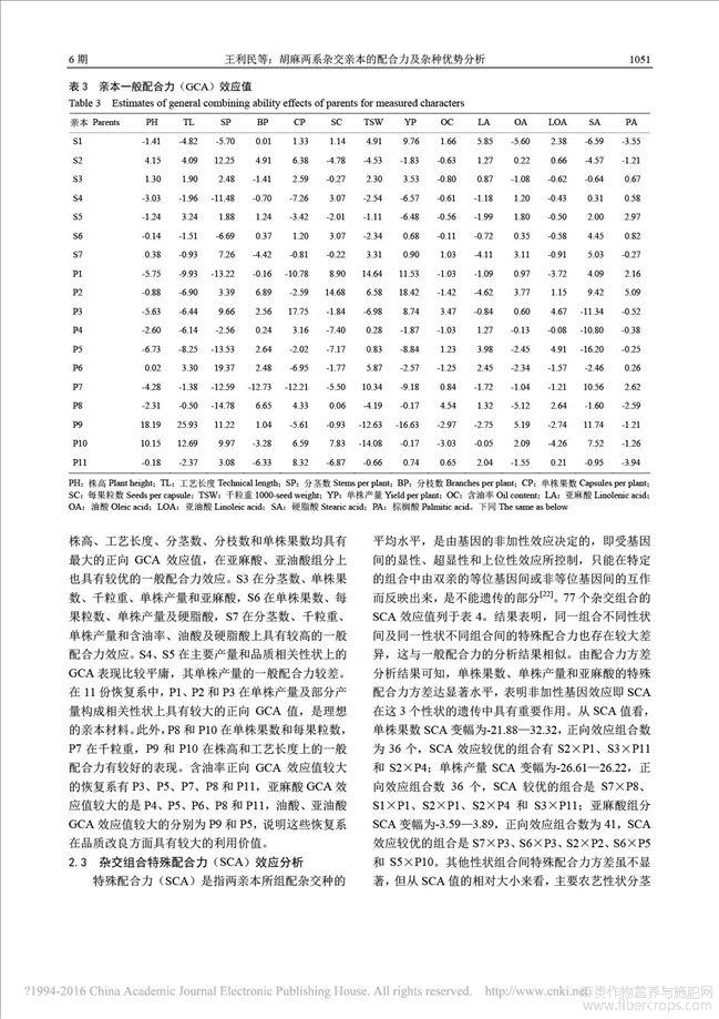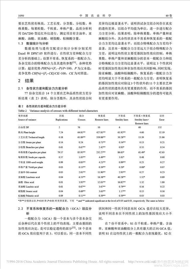 胡麻两系杂交亲本的配合力及杂种优势分析