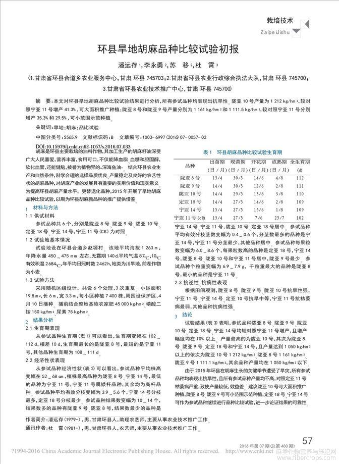 环县旱地胡麻品种比较试验初报