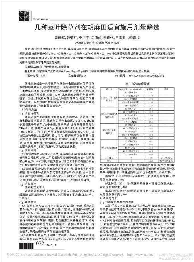 几种茎叶除草剂在胡麻田适宜施用剂量筛选