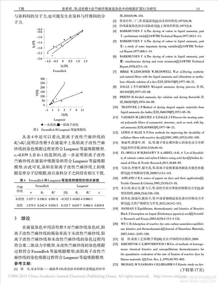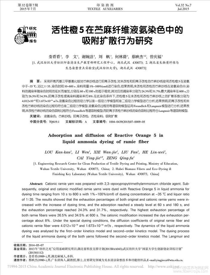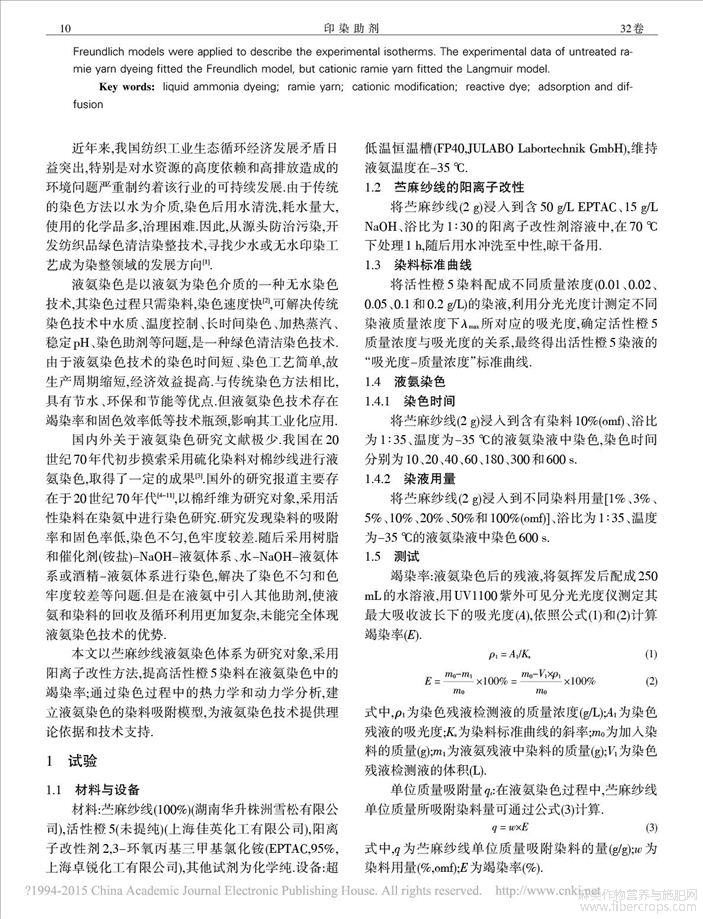 活性橙5在苎麻纤维液氨染色中的吸附扩散行为研究