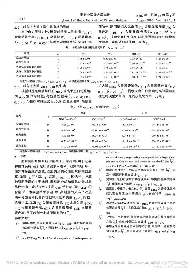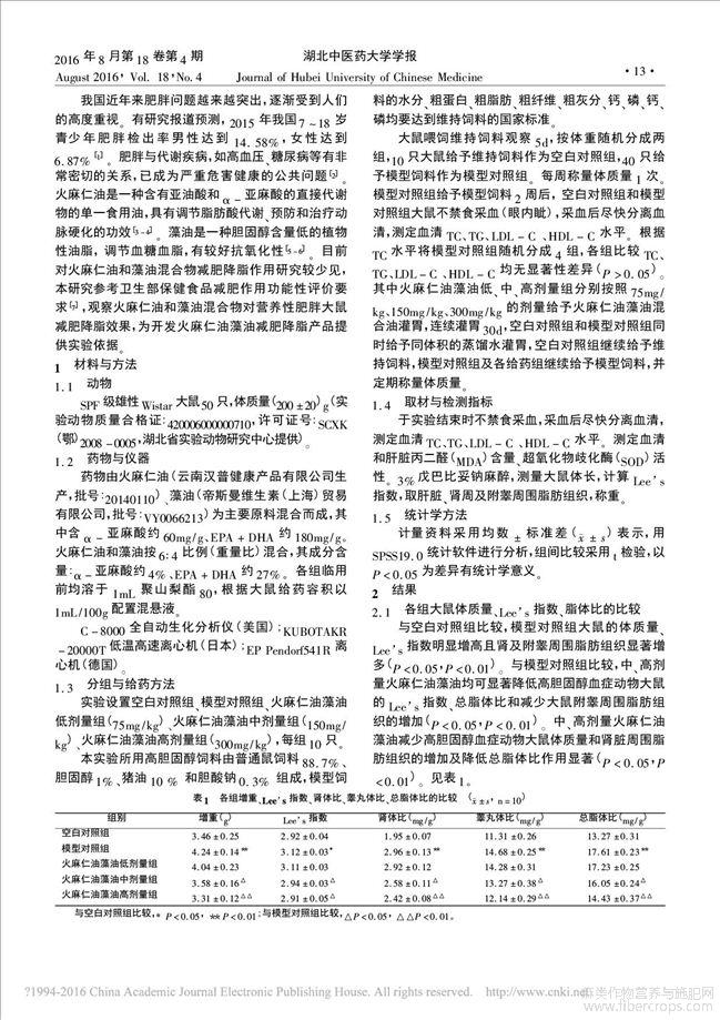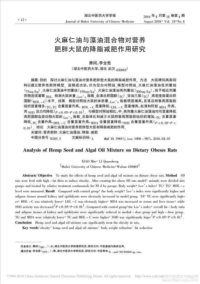 火麻仁油与藻油混合物对营养肥胖大鼠的降脂减肥作用研究