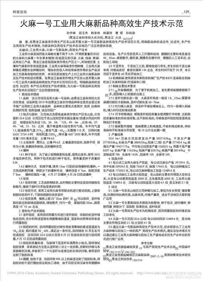 火麻一号工业用大麻新品种高效生产技术示范