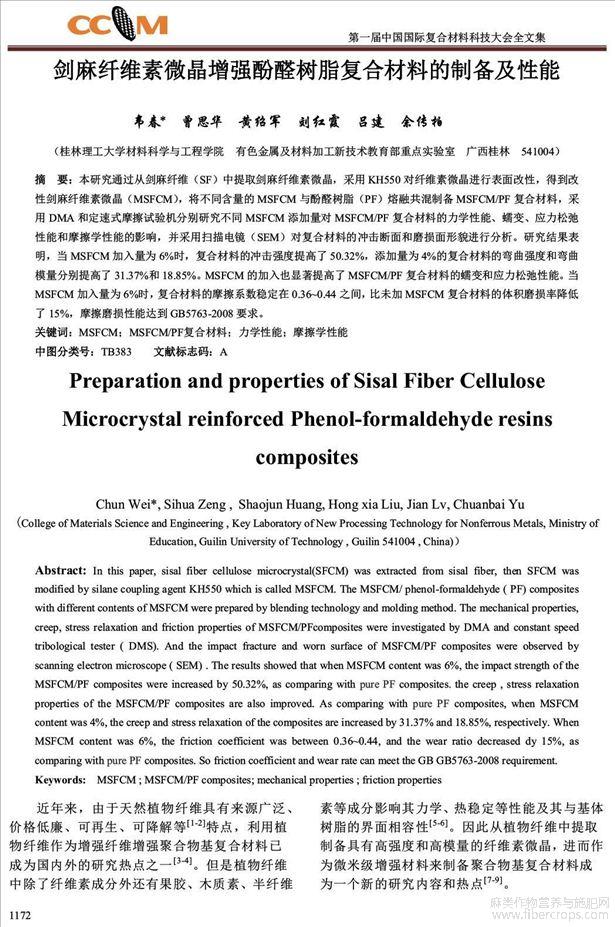 剑麻纤维素微晶增强酚醛树脂复合材料的制备及性能(会议论文)