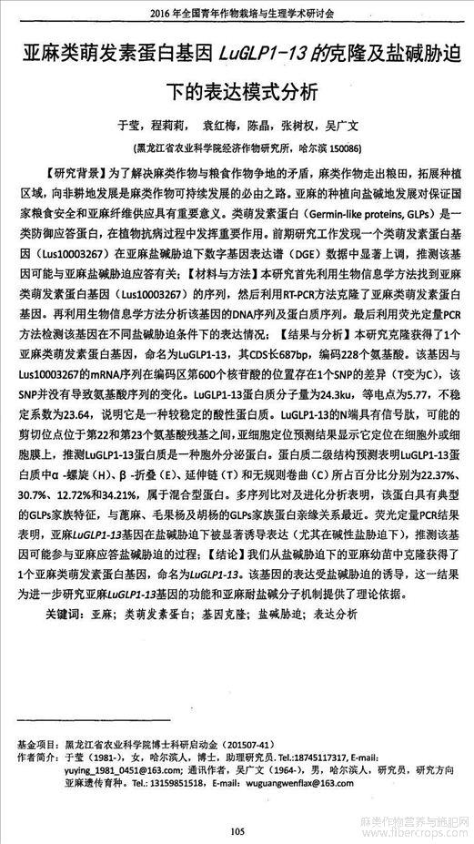 亚麻类萌发素蛋白基因LuGLP1-13的克隆及盐碱胁迫下的表达模式分析_于莹(会议论文)