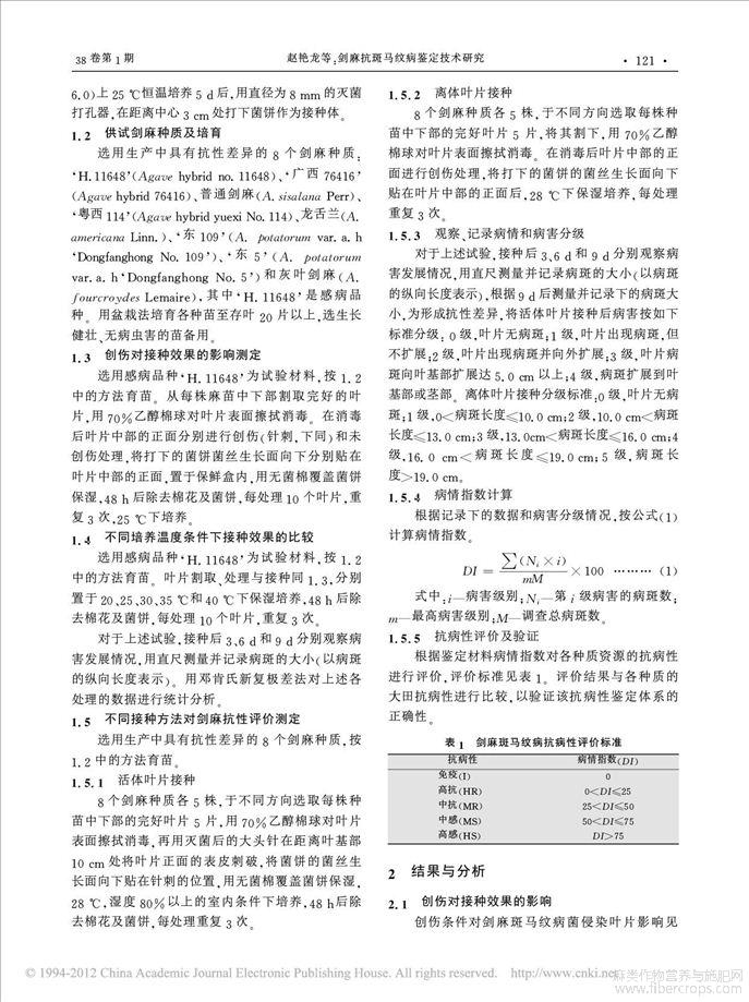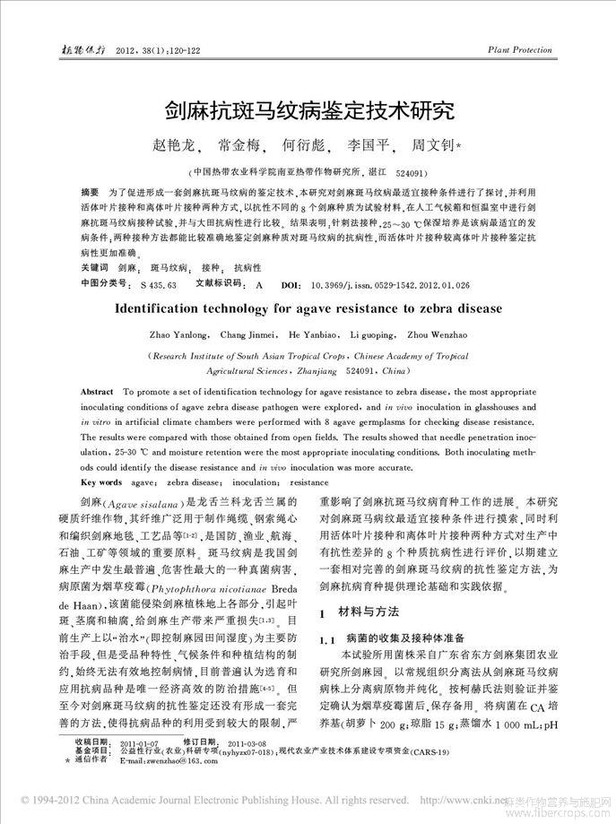 剑麻抗斑马纹病鉴定技术研究