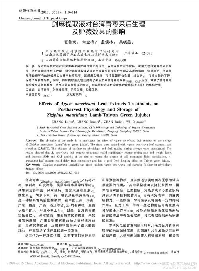 剑麻提取液对台湾青枣采后生理及贮藏效果的影响
