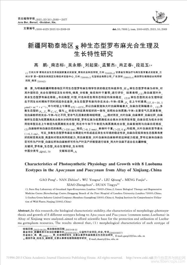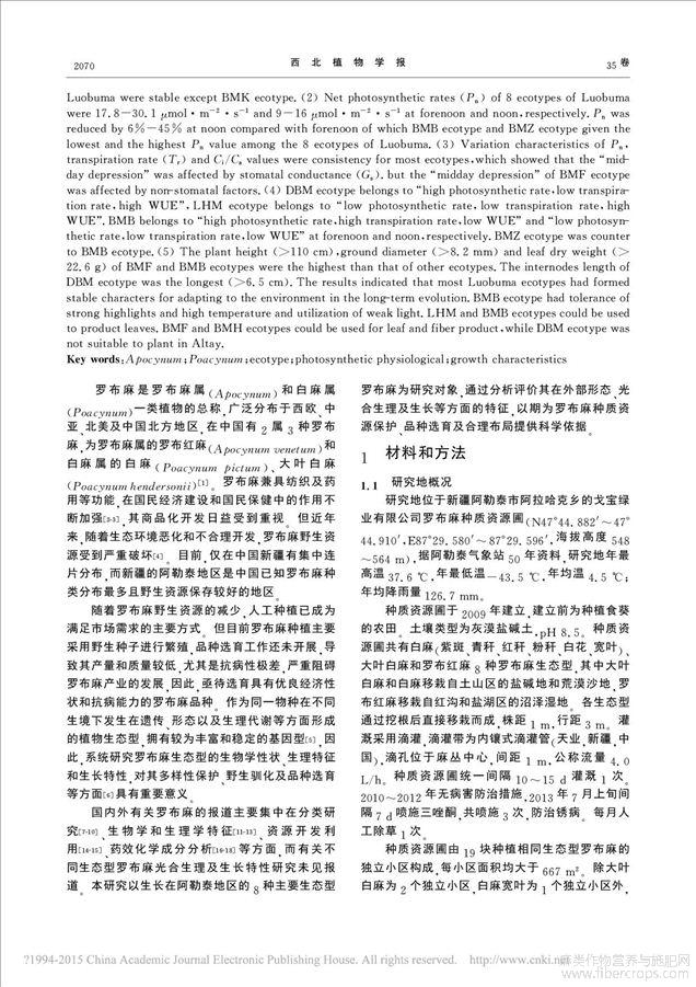 新疆阿勒泰地区8种生态型罗布麻光合生理及生长特性研究