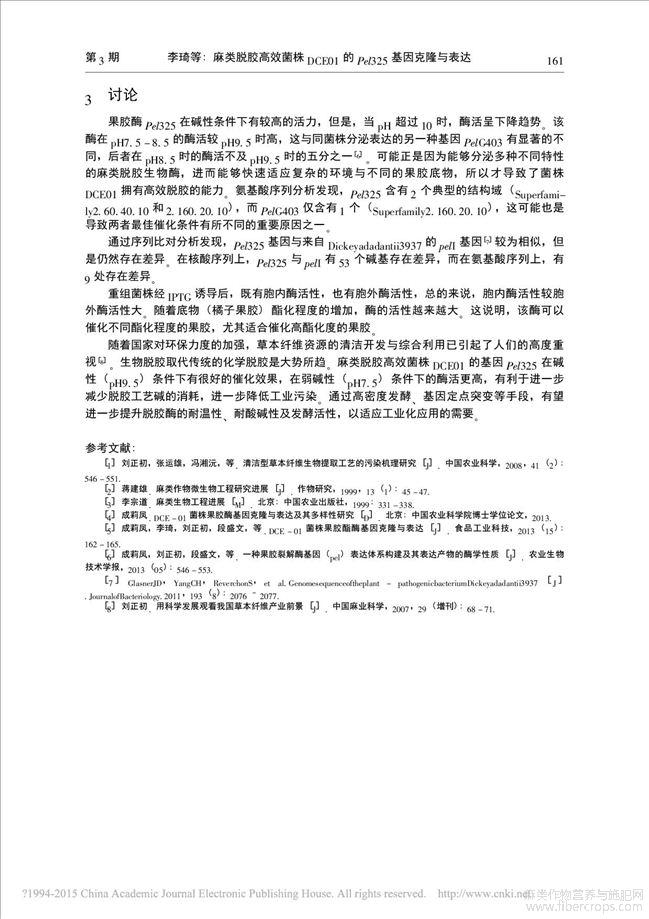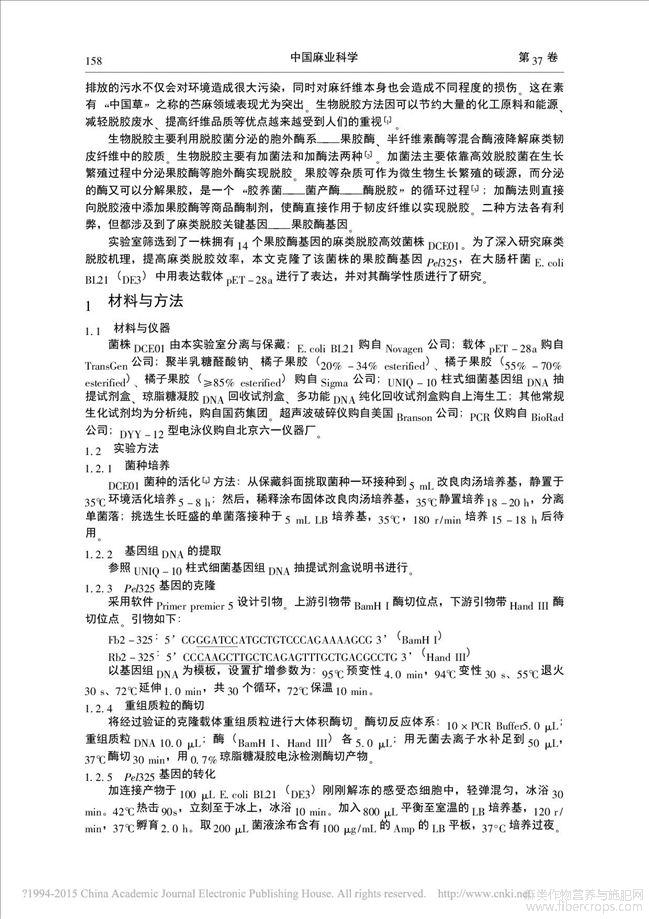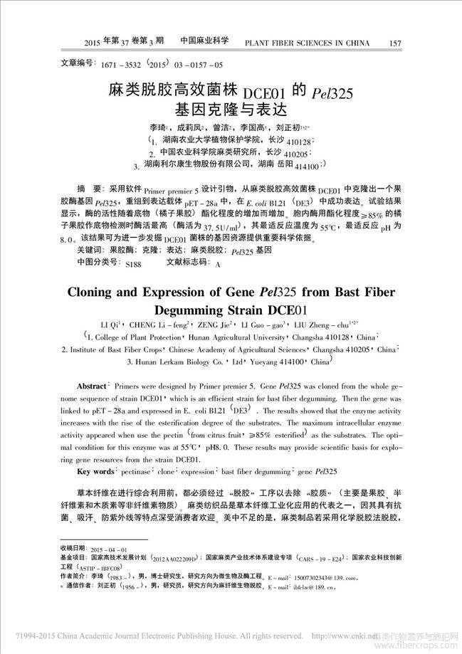 麻类脱胶高效菌株DCE01的Pel325基因克隆与表达