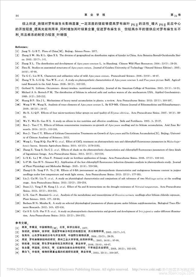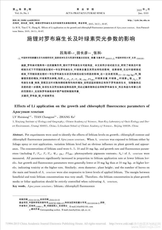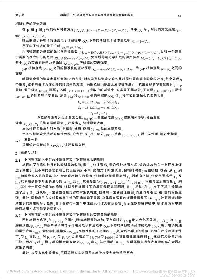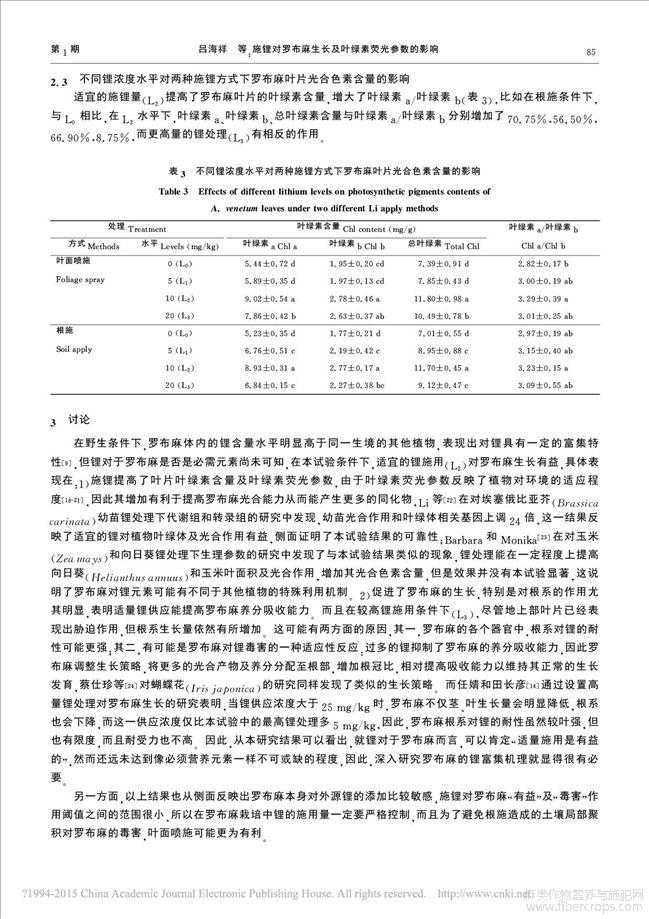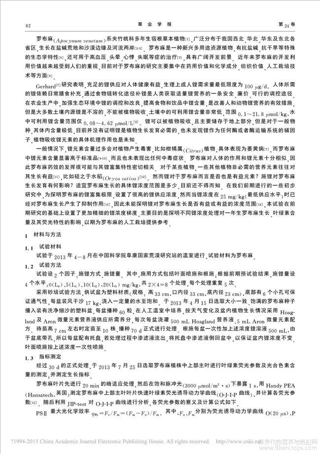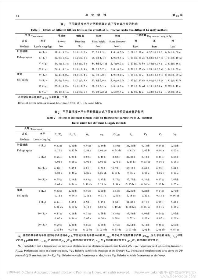 施锂对罗布麻生长及叶绿素荧光参数的影响