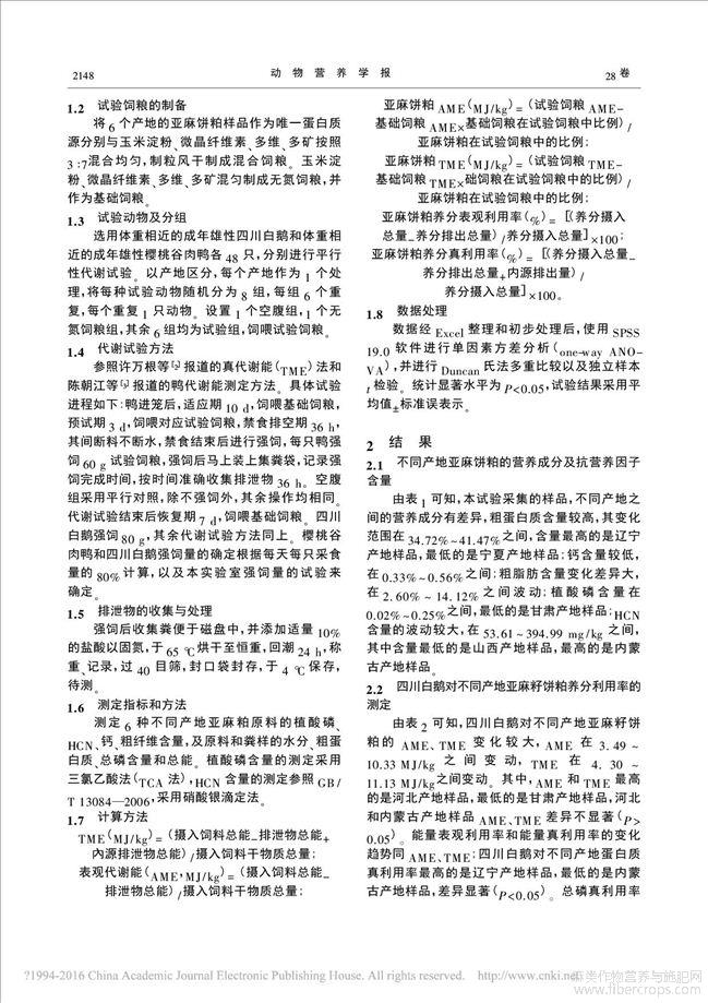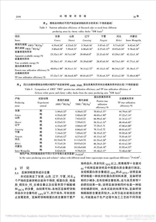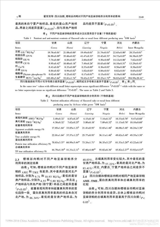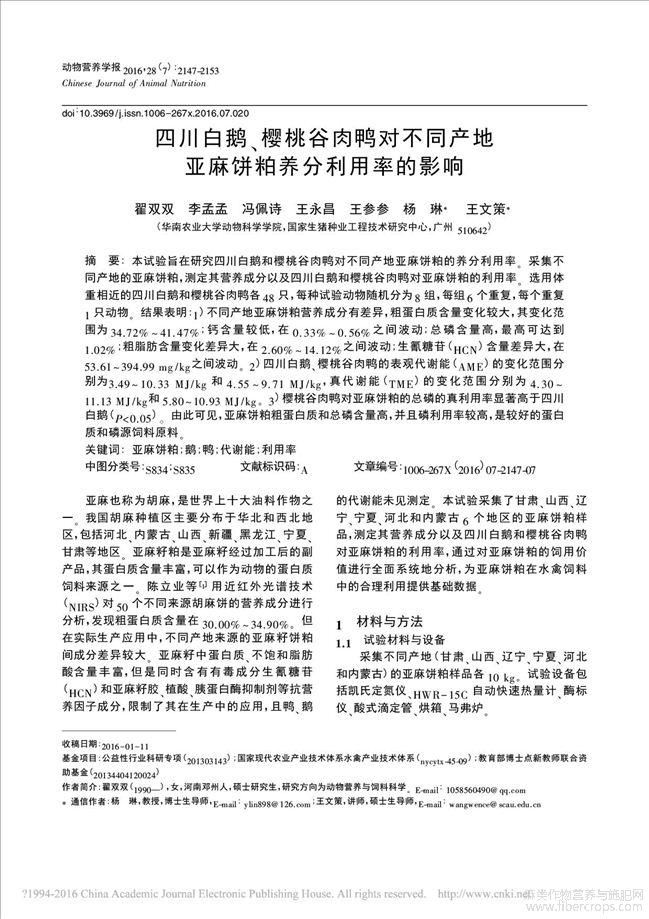 四川白鹅_樱桃谷肉鸭对不同产地亚麻饼粕养分利用率的影响