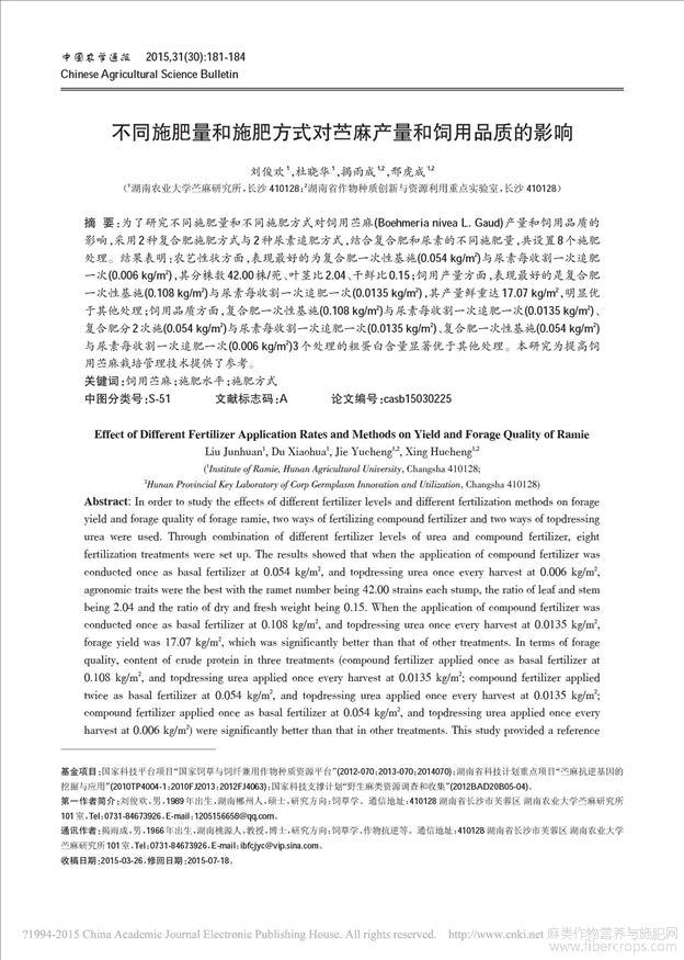 不同施肥量和施肥方式对苎麻产量和饲用品质的影响_刘俊欢