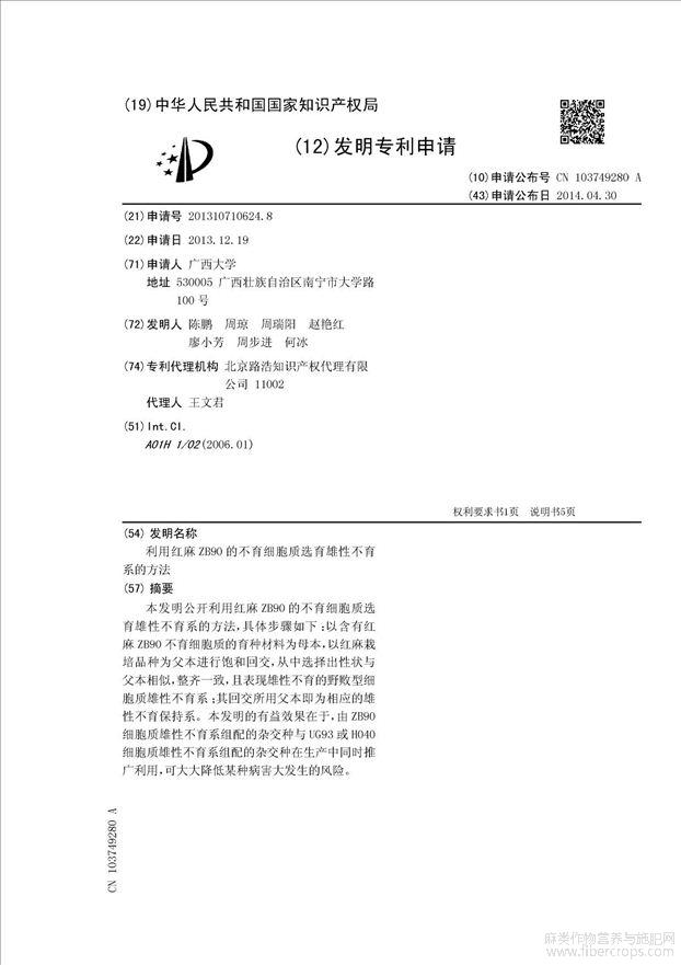 利用红麻ZB90的不育细胞质选育雄性不育系的方法(公开专利)