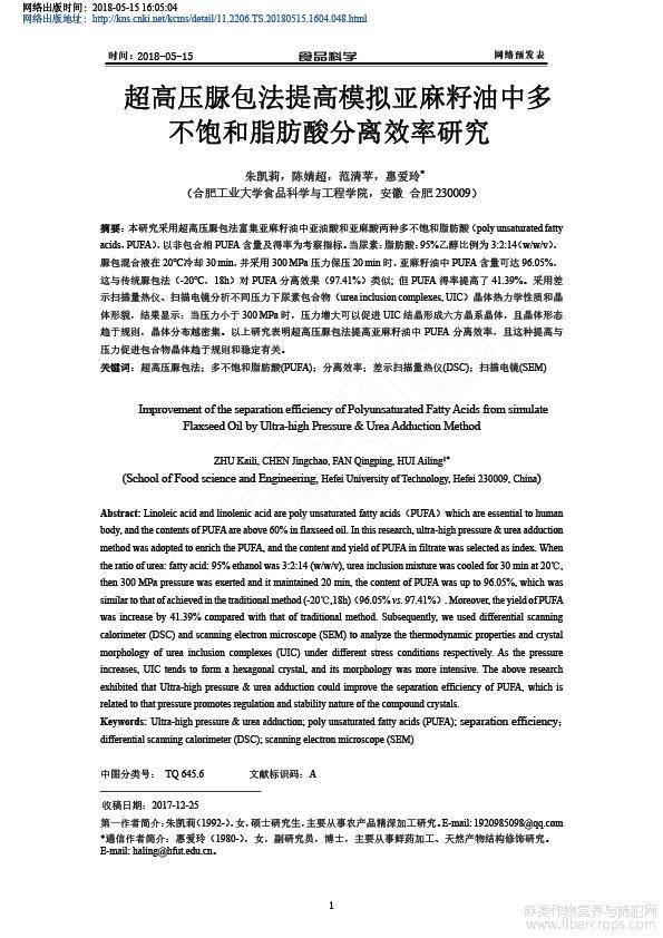 超高压脲包法提高模拟亚麻籽油中多不饱和脂肪酸分离效率研究_朱凯莉