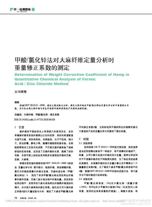 甲酸/氯化锌法对大麻纤维定量分析时重量修正系数的测定_刘惠珊