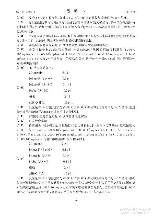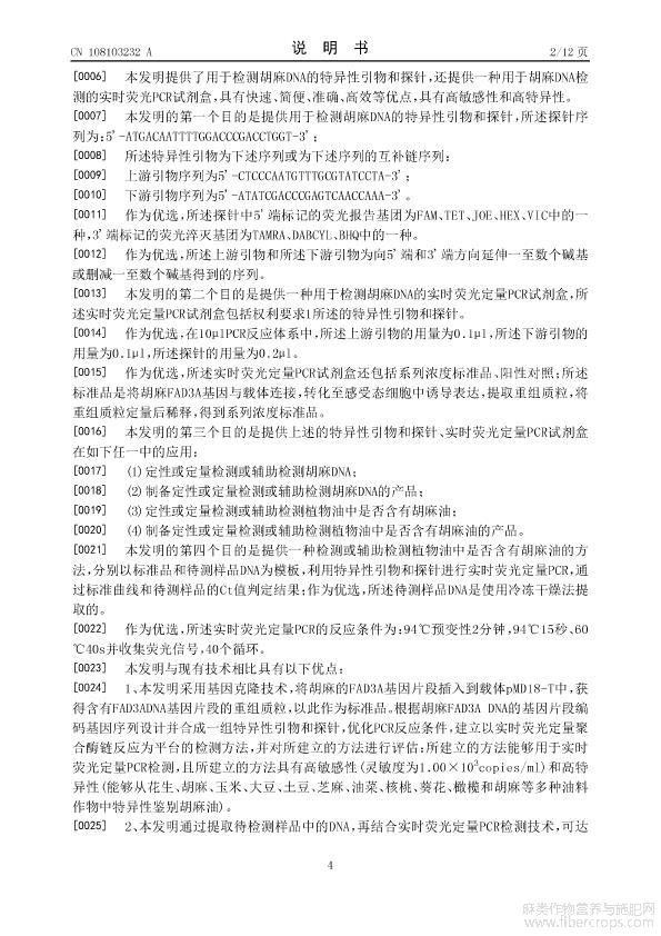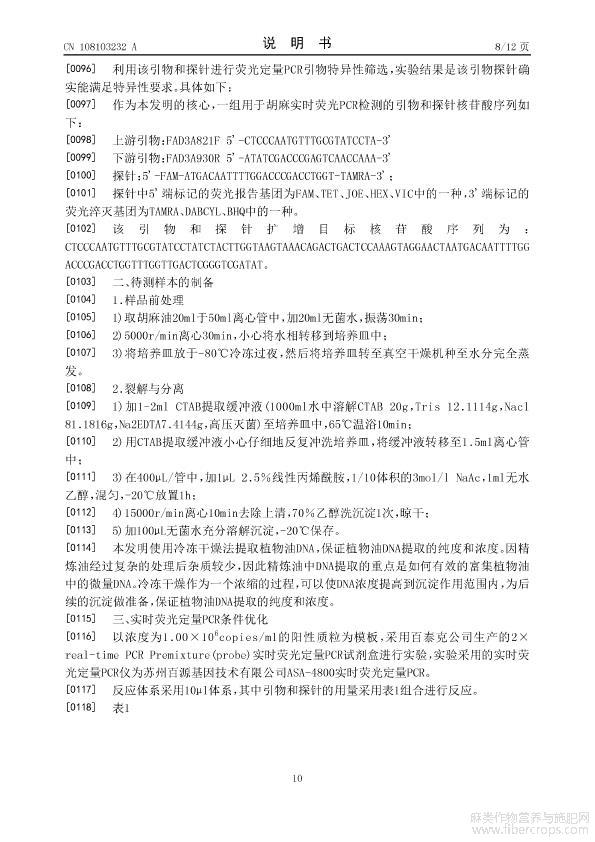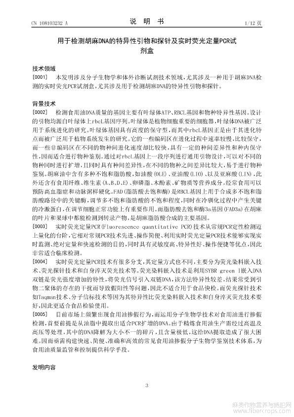 用于检测胡麻DNA的特异性引物和探针及实时荧光定量PCR试剂盒