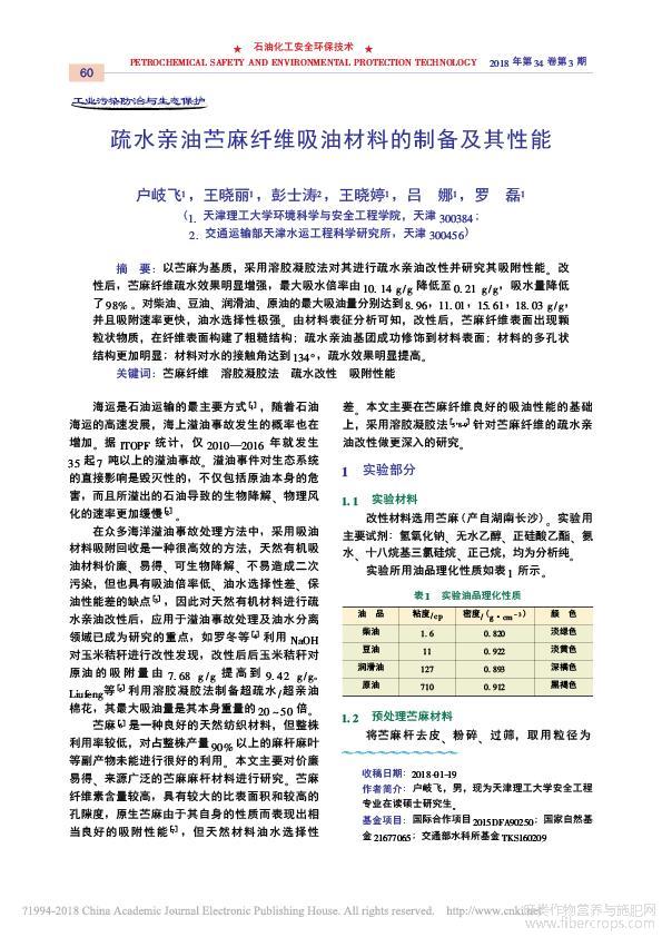 疏水亲油苎麻纤维吸油材料的制备及其性能
