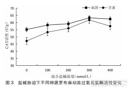 从图3可以看出,2个种源地罗布麻幼苗叶片CAT活性在不同浓度梯度下变化趋势相似,均随盐碱胁迫浓度的增加呈现先增加后降低的趋势。31团和甘肃民勤罗布麻幼苗叶片CAT活性在300mmol/L浓度梯度下达到最大值,分别为63.33U/g和61.79U/g。甘肃民勤罗布麻在中等浓度胁迫300mmol/L下的幼苗叶片CAT活性较高浓度胁迫400mmol/L和低浓度胁迫100mmol/L分别降低了1.43%和8.70%。31团和甘肃种源地罗布麻幼苗叶片CAT活性均在300mmol/L浓度梯度开始下降,400mmol/L浓度梯度时CAT活性分别为62.44U/g和57.50U/g。罗布麻幼苗叶片对高浓度胁迫的抵抗能力较弱,随着胁迫时间的推移,活性氧积累到一定程度,体内逐渐合成CAT,清除活性氧,防止大分子物质发生氧化作用。