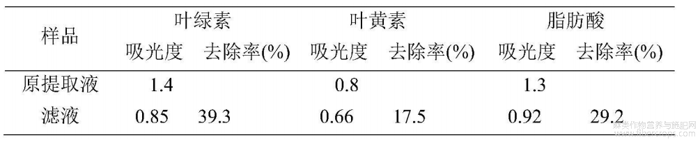 表3 50ml净化管中工业大麻中叶绿素、叶黄素、脂肪类物质的去除效果