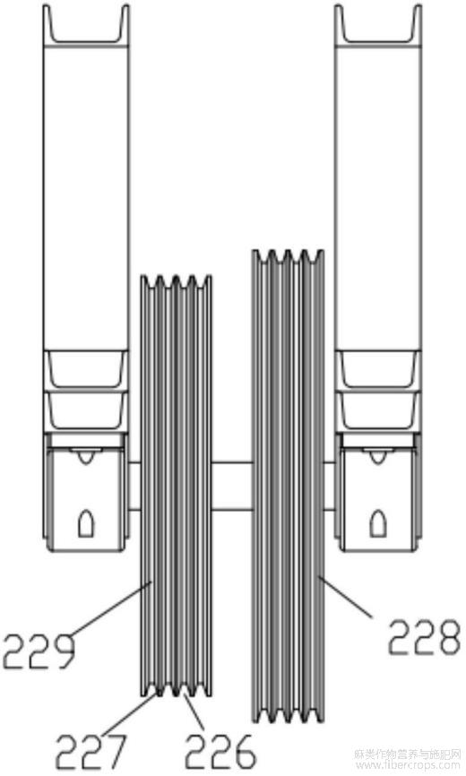 在本实施例中,为了苎麻更好的夹持输送,防止苎麻纤维的缠绕,反拉夹持输送带210和辅助夹持输送带211上沿苎麻输送方向设置有环形凹槽226和环形凸起227,上下相对的环形凹槽226和环形凸起227相互啮合,同时还可以起到压裂麻骨的作用。具体的,反拉夹持输送带210包括内侧反拉夹持输送带228和外侧反拉夹持输送带229,内侧反拉夹持输送带228靠近前剥麻辊251设置,内侧反拉夹持输送带228和外侧反拉夹持输送带229并行设置且等速运动,内侧反拉夹持输送带228的夹持面高于外侧反拉夹持输送带229的夹持面,进而前剥麻辊251剥麻反向拉扯反拉夹持输送带210时,由于外侧反拉夹持输送带229和内侧反拉夹持输送带228存在高度差,进而会加大拉扯过程苎麻与反拉夹持输送带210之间的摩擦阻力,防止前剥麻辊251将苎麻拉出。