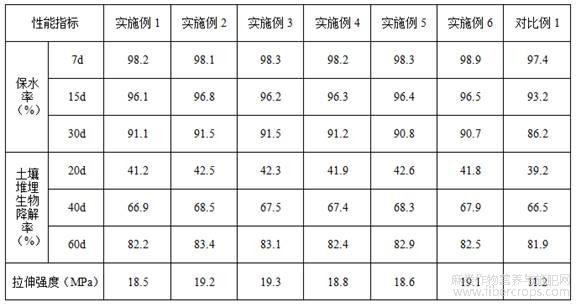(1)保水率:称取已处理的河沙、泥土,按照1:1的标准混配土壤,加入塑料杯中,加入适量自来水,使吸水饱和,然后用本发明制得的复合地膜紧密包裹,称取初始重量m0,置于室外用风干燥环境,分别在7d、15d、30d内称量总重mi,测试3次,根据公式计算土壤保水率平均值Ri=mi/m0×100%;