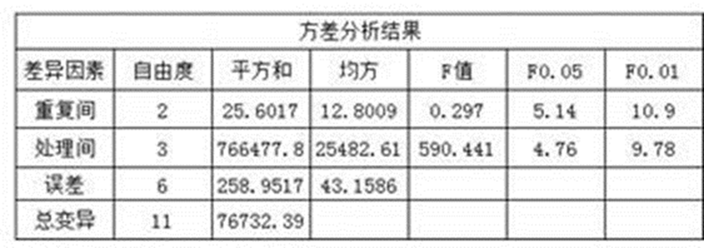 从上表可以看出重复间F值小于F0 .05,来自试验地误差很小,表明重复间差异不显著,说明土壤肥力均匀。处理间则F值>F0 .01,说明处理间差异达到极显著水平。