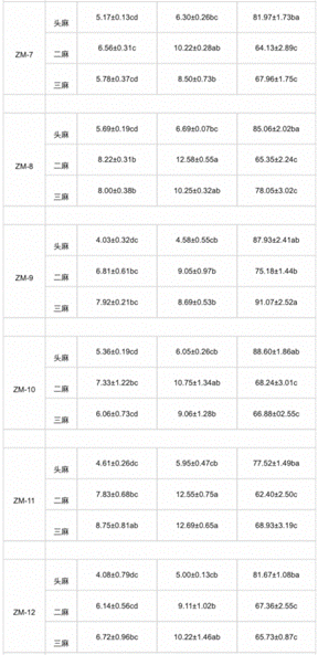 鲜皮出麻率:在苎麻收获期,用电子秤测量每个小区剥离的鲜皮重量;用“72型”简易刮麻器刮制鲜皮后,充分晒干水分,用电子秤测量原麻产量。