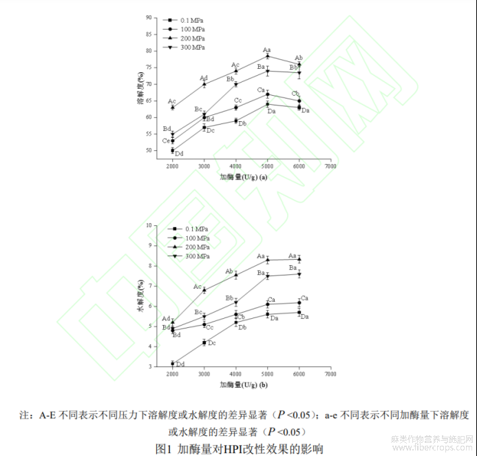 不同加酶量在不同压力下对HPI水解度的影响如图1(b)所示,由图可知,HPI水解产物水解度随酶量增加先明显上升后缓慢上升,说明酶用量增加可以增大酶解程度[22],但在这个过程中,蛋白酶逐渐趋向饱和,因此水解度随后上升缓慢。与溶解度变化趋势一致,水解度在200MPa时达到最大值。综上,选择5000U/g为HPI酶解改性反应最适加酶量。