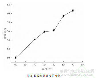 图4反映了处理温度对苎麻骨脱胶率的影响。脱胶率伴随着温度的上升而逐渐增加,至85℃时脱胶率达到59.46%。温度为90℃时,脱胶率相比85℃时仅仅增加了1.24%。较高的反应温度对脱胶效果影响很小,考虑到脱胶能耗以及木质素在高温下容易缩合冷凝沉积在固体表面,将温度确定在75~85℃。