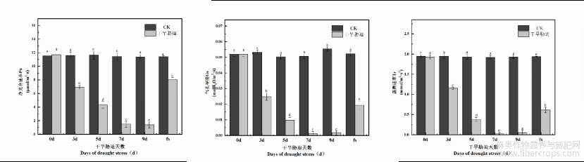 由图2可知,不同干旱胁迫处理的大麻苗其光响应曲线表现出一定的差异性。不管是净光合速率、气孔导度,还是蒸腾速率都随着干旱时间的延长而呈现降低趋势,尽管气孔导度和蒸腾速率在处理的9d比7d时有所上升,但差异不显著(P>0.05)。复水后,净光合速率、气孔导度和蒸腾速率的值有所提高,但仍低于CK,并且差异显著(P<0.05)。
