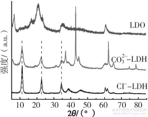 Cl--LDH、CO32--LDH及LDO样品的XRD测试结果见图1。