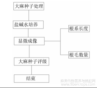 通过盐碱水对大麻种子进行培养,并通过显微成像设备对大麻种子的根系长度与根毛数量进行观察拍摄,方便对大麻种子进行评级,增加对大麻种子评价精度,使根系长度与根毛数量更加清晰,方便记录。