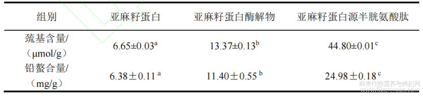 由表3可知,在经过单因素正交试验优化酶解条件后,亚麻籽蛋白酶解物的巯基含量增加,达到亚麻籽蛋白的2.01倍,铅螯合量达到1.79倍。经ThiopropylCrystarose6FastFlow共价色谱法得到的半胱氨酸肽,其巯基含量达到亚麻籽蛋白酶解肽的3.35倍之多,而铅螯合量是酶解肽的2.19倍。以上结果均表明采用共价色谱法能有效的对含巯基的肽段进行富集,得到铅螯合量较高的亚麻籽蛋白源半胱氨酸肽。