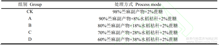 供试材料水稻秸秆为去除籽粒的茎叶和湘饲纤兼用 1 号苎麻品种,苎麻副产物包括:麻骨、麻叶、麻壳,两种试验材料均收集于湖南农业大学耘园试验基地。青贮前各材料的主要化学成分见表1。